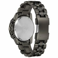 Citizen® Eco-Drive Nighthawk watch features a gold-tone stainless steel case and bracelet, and a crystal accented champagne dial. Additional features include 1/5 second chronograph that measures up to 60 minutes, 12/24-hour time, date function, and water resistant to 200 meters.