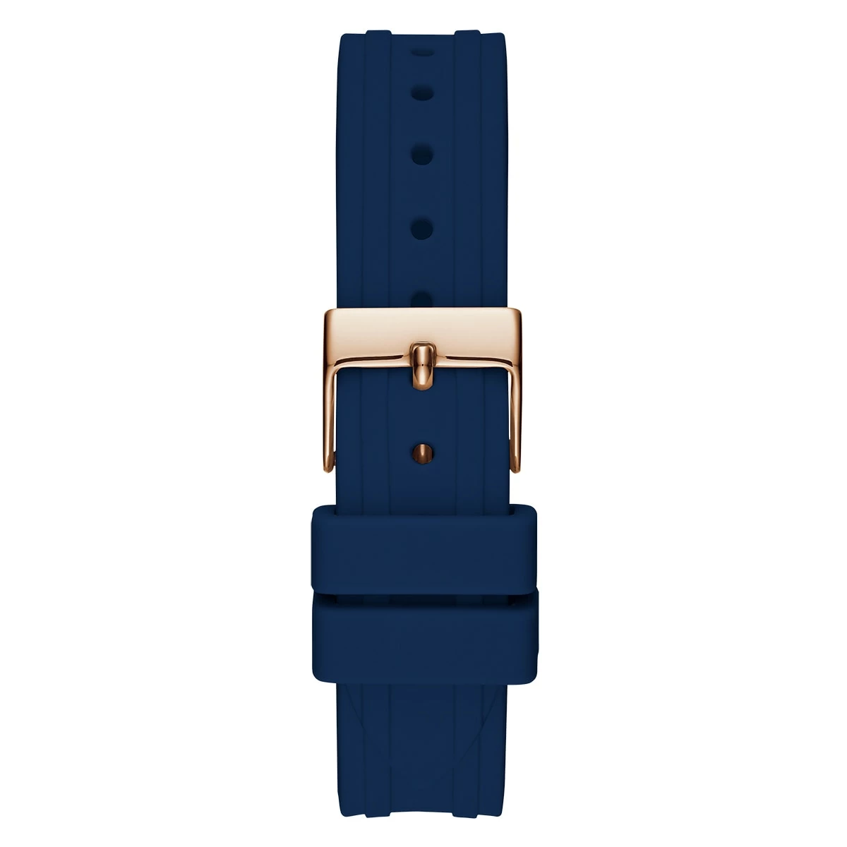Guess sport watch with sparkling crystals pairs effortlessly with any look giving you the gift of glam! 36MM Polished Rose Gold case with crystal details on a blue silicone strap.