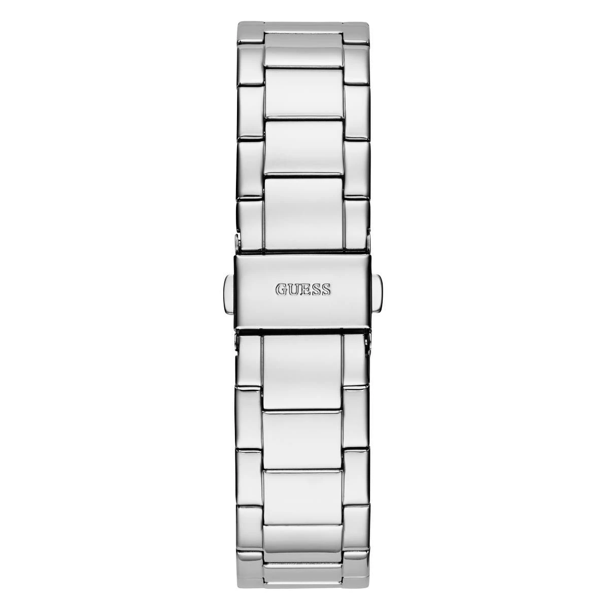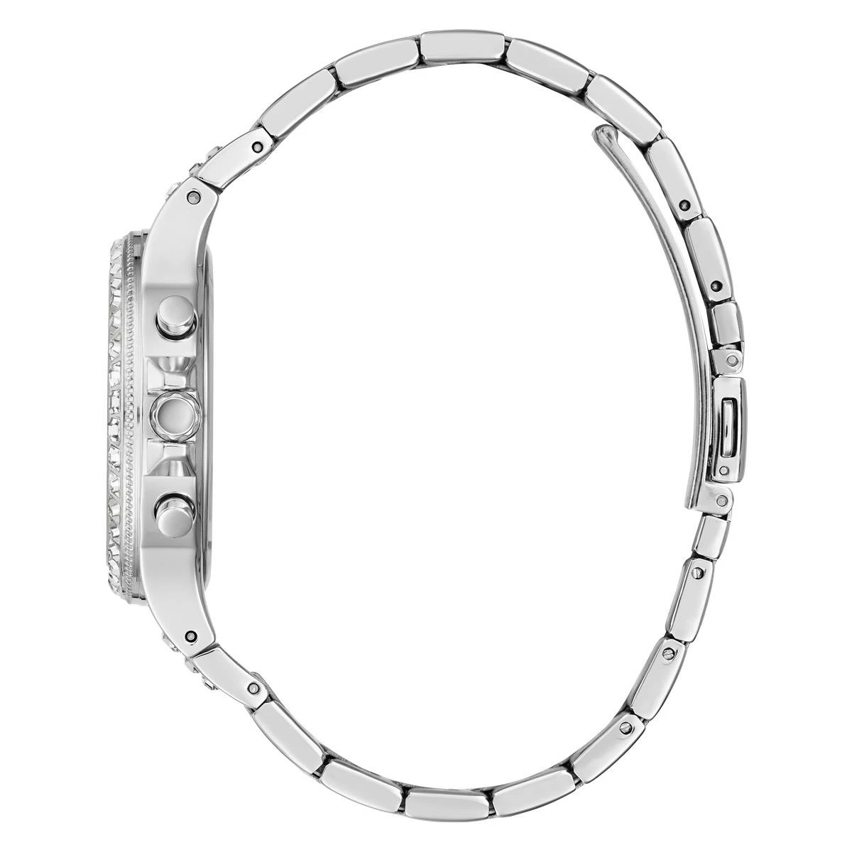 Shine bright like the moonlight in this Guess fully crystal case and glitz subdial timepiece. Stainless steel case. Silver-tone bracelet with pilot buckle. Multifunction.