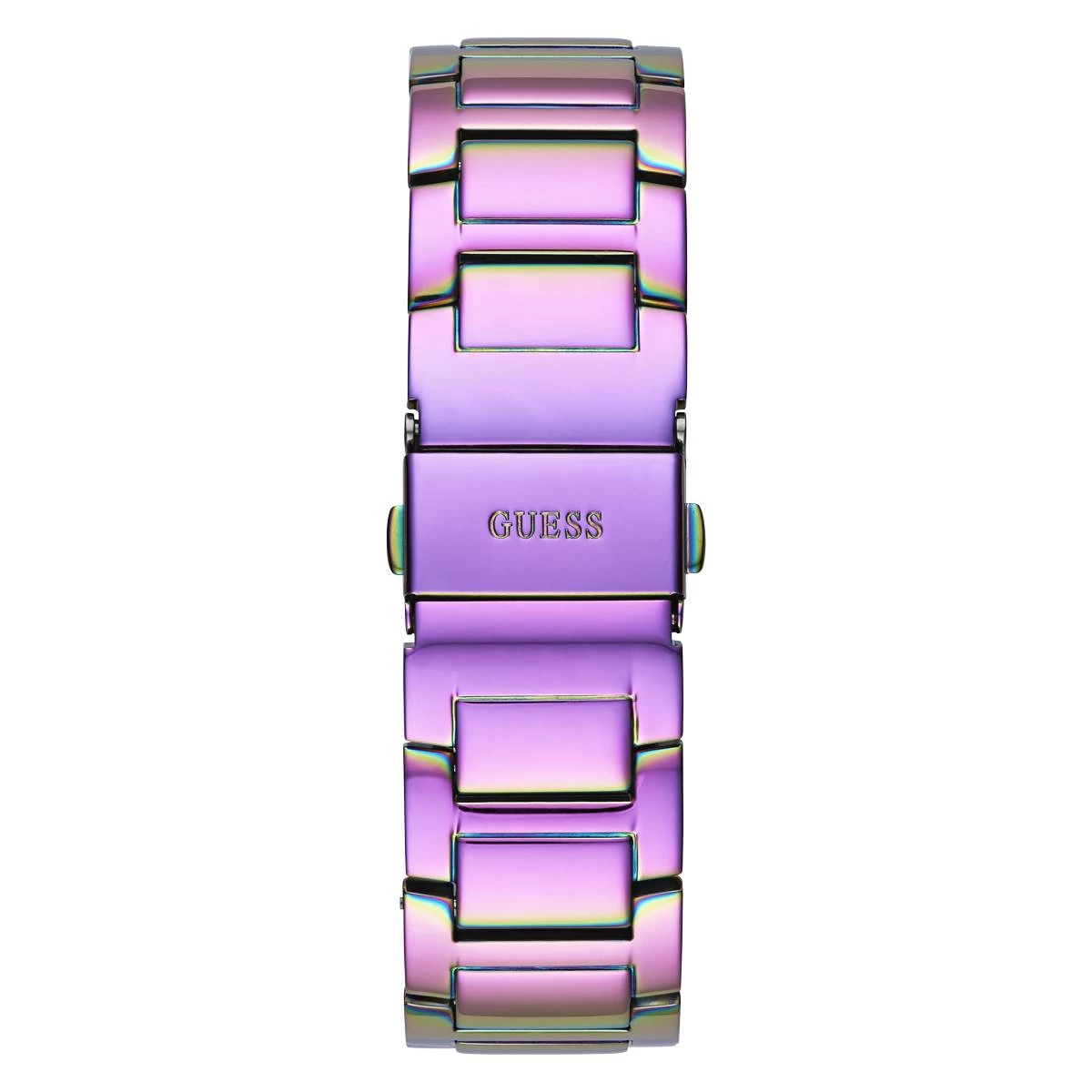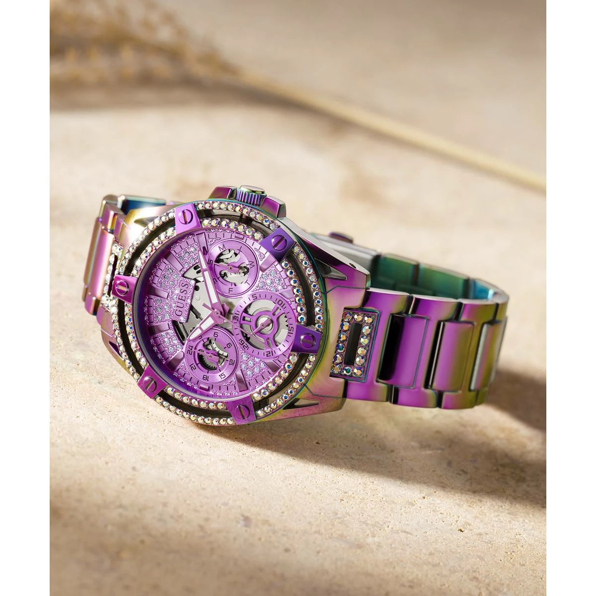 This Guess Watches® iridescent stainless steel watch is a new take on a classic style with a cutting-edge design including all-over cut-thru details from the case to the bracelet as well as integrated on the dial design where you can see thru to the movement of this multi-function watch. Bringing bling elements to a new level with case and bracelet adornment and glitz powder on the dial to give an overall look of luxury.