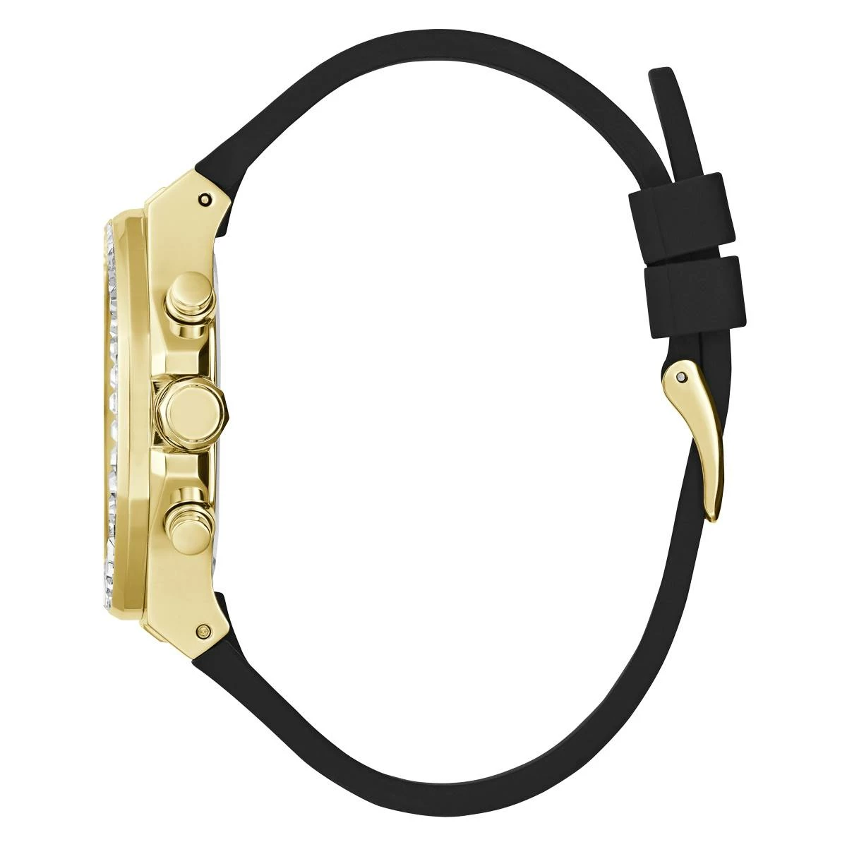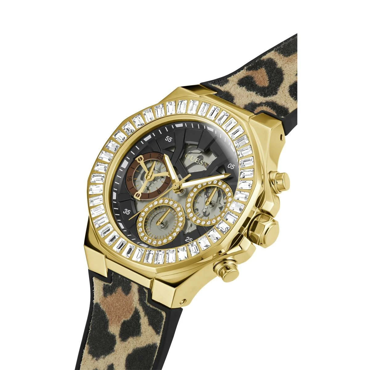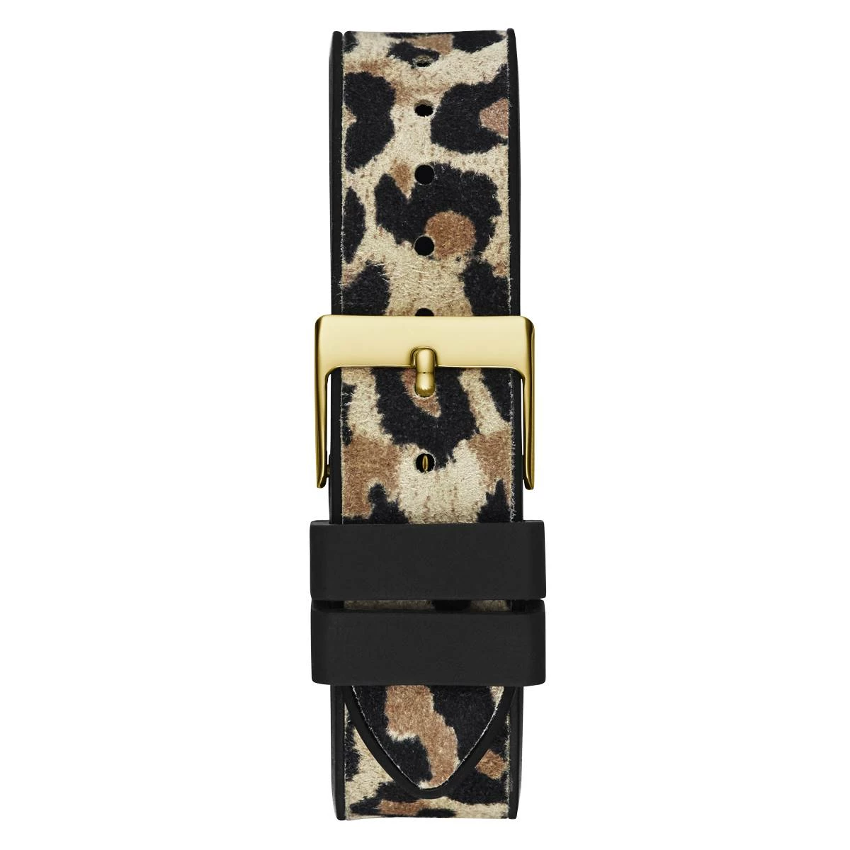 A style that is pure rapture the Guess Watches® leopard print leather watch showcases an oversized baguette encrusted bezel and cut thru dial design with glitz and contrast colors completed by a signature leather on silicone FLEX strap.