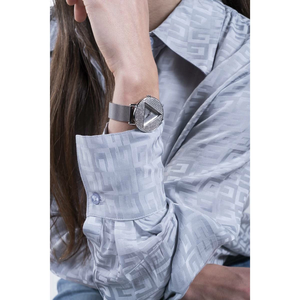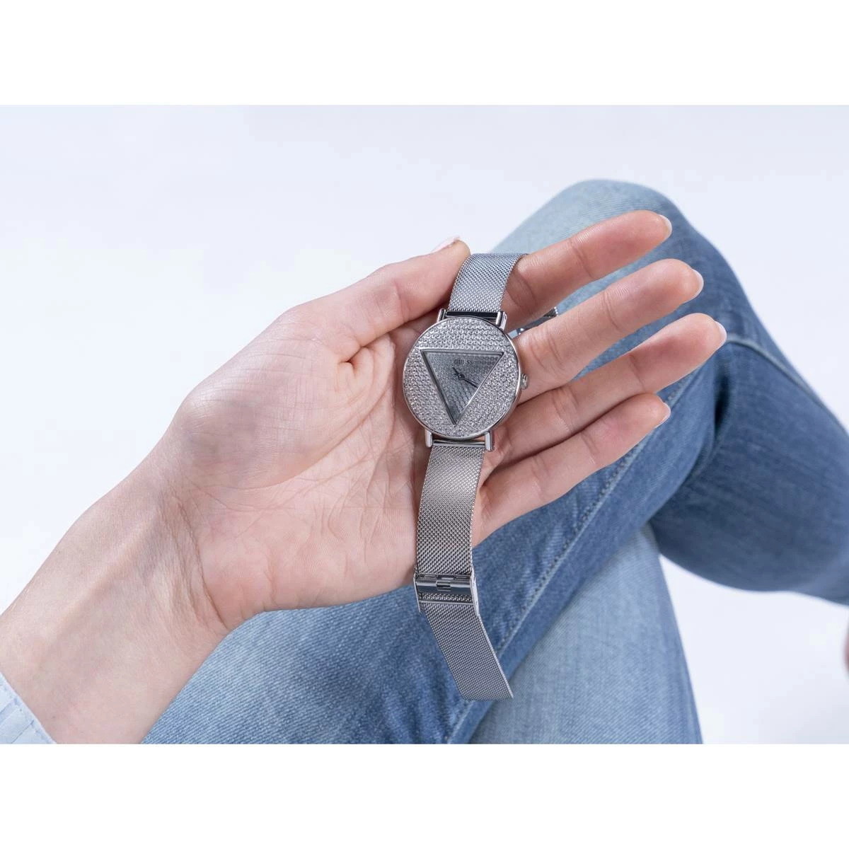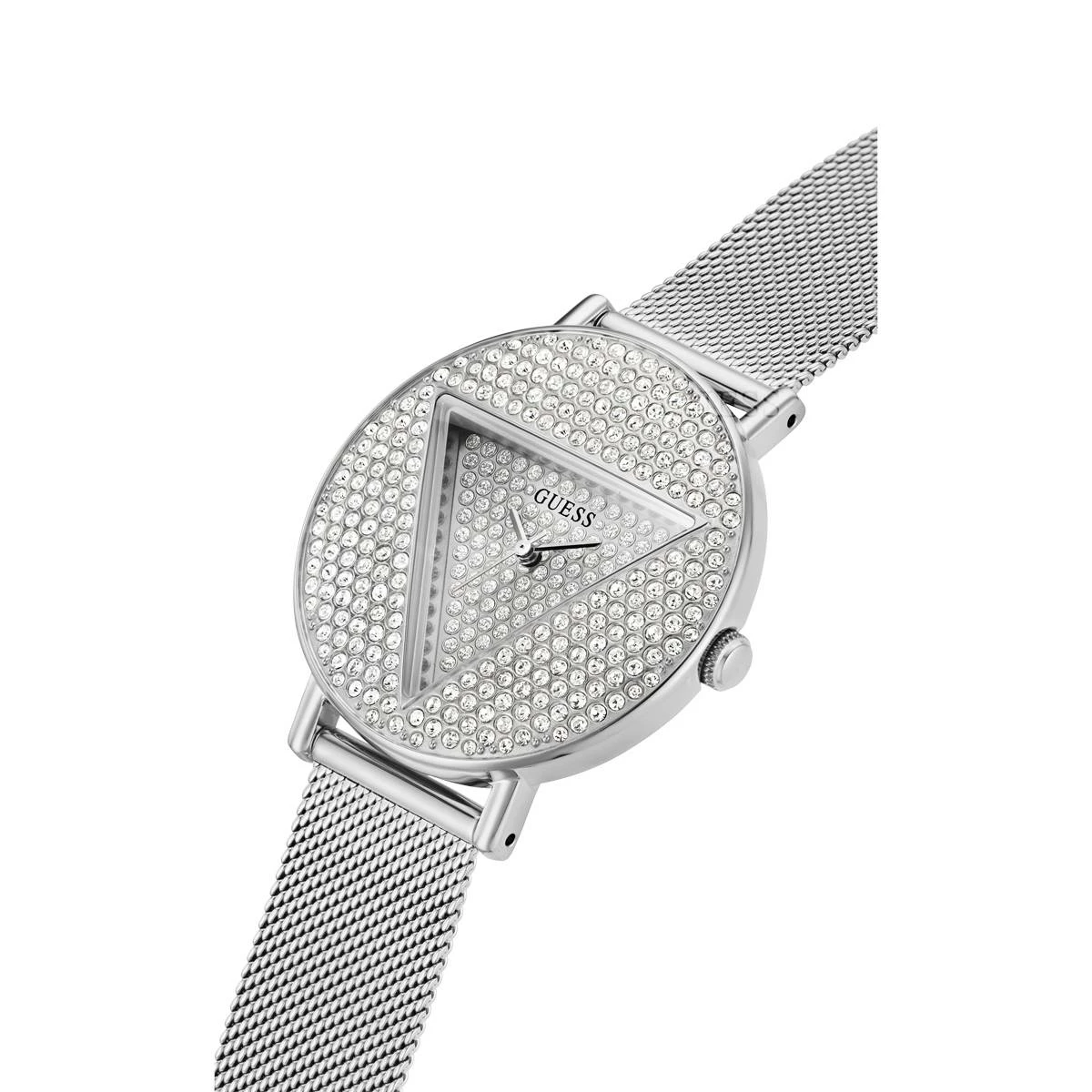 Iconic in every way, this dazzling Guess Watches® silver case stainless steel watch has a triangle dial inset with full glitz and is paired with a sleek mesh bracelet with self-adjustable links.