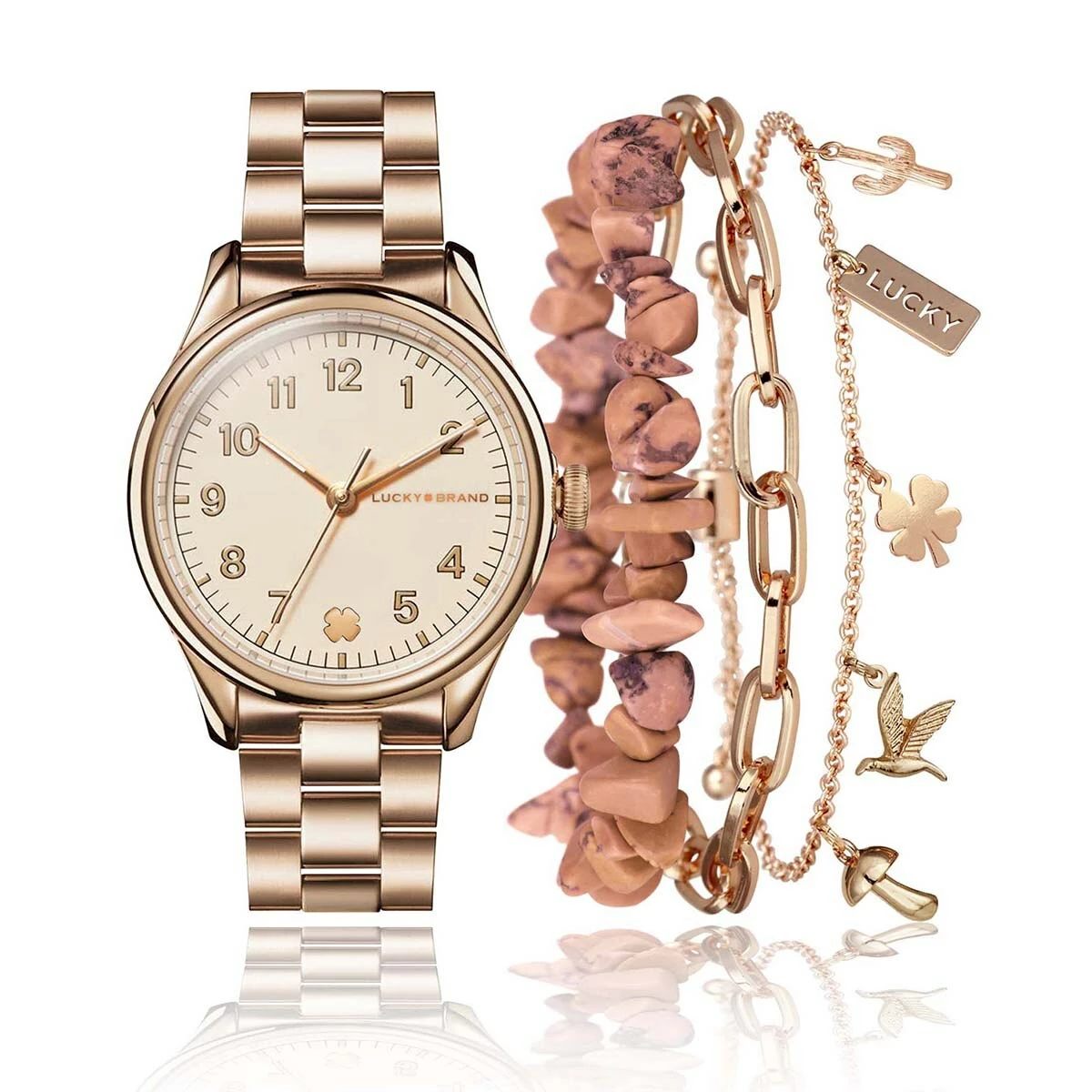 This Lucky Brand classic rose gold-tone easy-read watch and beatnik coral semi-precious stone set will quickly become one of your favorite go-to accessories.