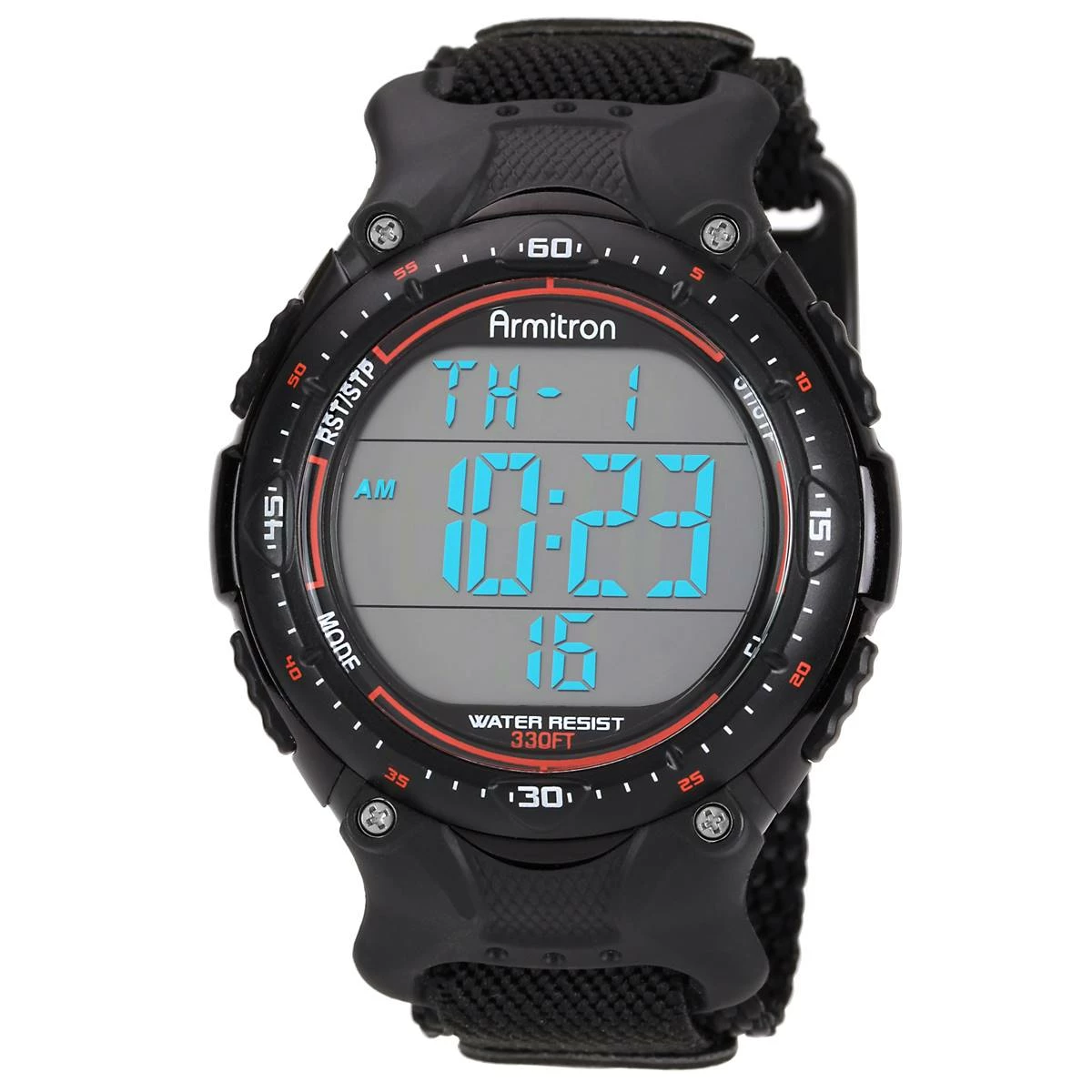 Dress up your wrist with this Mens Armitron® watch. Features include a black digital chronograph watch that is 10.35 inches in length with a velcro strap.Limited Manufacturer’s Warranty.