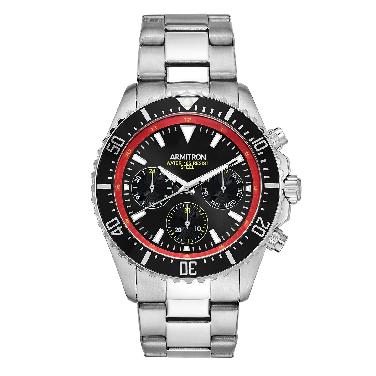 Perfect for a day at the office and a night out. This Mens Armitron stainless steel muti function stainless steel watch features a multifunction dial with aluminum accents.