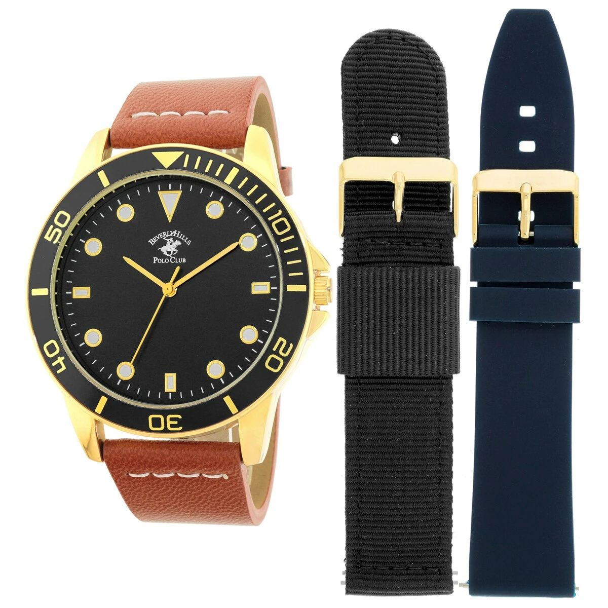 The Mens Beverly Hills Polo Club analog interchangeable watch set features a brown strap, black strap, blue rubber strap, black enamel dial, and gold case.