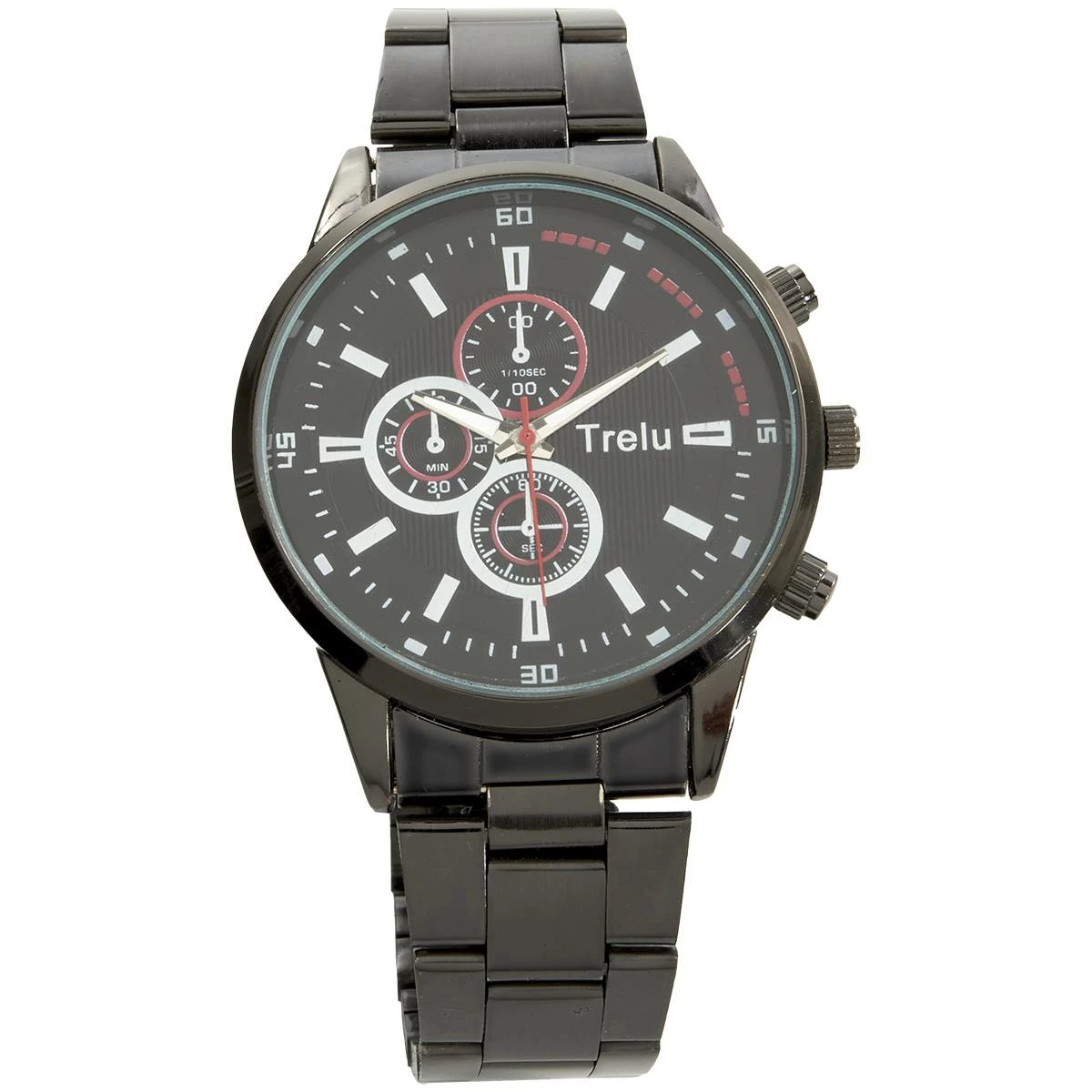 Mens analog quartz metal link watch features a solid black dial with a 45mm hematite case and an accented red second hand. Water resistant.