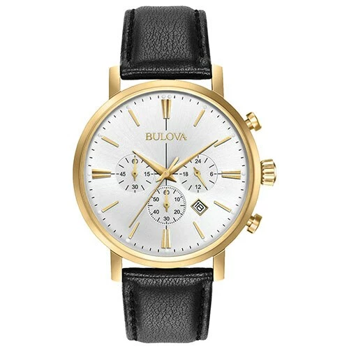 The Mens Bulova Classic Collection watch features a gold-tone stainless steel case, a six hand chronograph, and a silver and white dial. It features double domed mineral glass, a smooth black leather strap with a simple three piece buckle closure, and is water resistant up to 30 meters. Dimensions: 41mm.