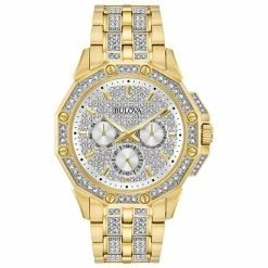 This Mens Bulova Crystals watch showcases a stunning gold-tone stainless steel case that is embellished with 308 crystals on the bezel, bracelet and pavĆ© dial. Other features include: a multi-function movement and a gold-tone stainless steel bracelet with deployant closure. Water resistance to 30 meters. To clean wipe with a soft dry cloth. Case Dimensions: 42mm x 10mm. Style 98C126. Limited Manufacturer’s Warranty.