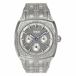 This Mens Bulova crystal accent chronograph bracelet watch showcases a unique and luxurious case, bezel, dial, and bracelet. It is finished in chic silver-tones and set with 412 crystals. This eye-catching timepiece features a smooth second tracker on the outer dial, three chronograph sub dials, black and white indices, a delicate second hand, and sword-shaped hour and minute hands accented in blue. The polished silver accents on the case and bracelet bring out the shine from all those crystals, while the dependable Japanese quartz movement ensures precision. This brilliant dress watch is water resistant to 99 feet. To clean wipe with a soft dry cloth. Case Dimensions: 40mm x 10mm.