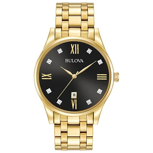 The Mens Bulova Diamonds Collection watch feature a masculine gold-tone stainless steel case and bracelet design with 8 diamonds inside the sleek black dial, a three hand calendar, flat mineral glass, and is finished with a simple deployment closure. Water resistance up to 30 meters. Case Dimensions: 40mm.