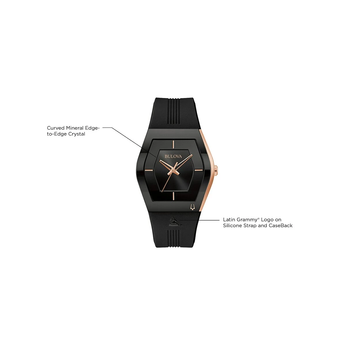 As the official Timepiece partner of The Latin GRAMMYs®, this Mens Bulova Latin GRAMMY® Gemini watch has a new curved tonneau design. The distinctive asymmetrical rose gold-tone stainless steel case with black signature Futuro edge to edge curved metalized crystal features a black dial with rose gold-tone accents. The black silicone strap features the iconic Latin GRAMMY® logo on the front, as well as on the case back which showcases the platinum colored logo to commemorate the 21st Annual Latin GRAMMY® Awards. The watch features a three-hand quartz movement, deployant buckle with pushers, and water resistance to 30 meters.Limited Manufacturer’s Warranty.