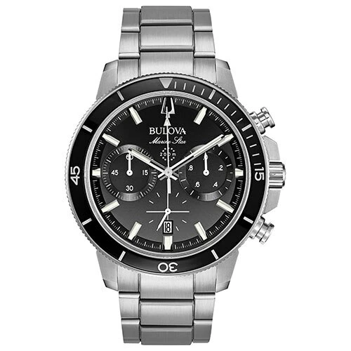 The Mens Bulova Marine Star watch features a new six hand chronograph movement, black glass insert on ratcheted rotating bezel, a black dial with luminous hands and markers, and a calendar feature. It features domed mineral crystal with a screw back case, a masculine stainless steel bracelet with fold over buckle closure and a safety bar and extender. Water resistant up to 200 meters. Watch case dimension: 45mm.Limited Manufacturer’s Warranty.Style 96B272.