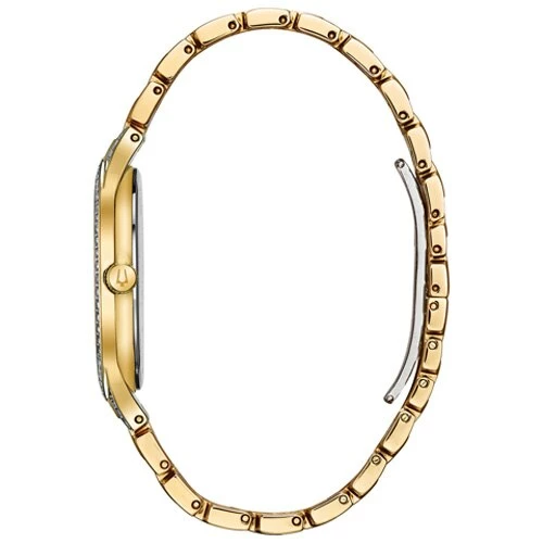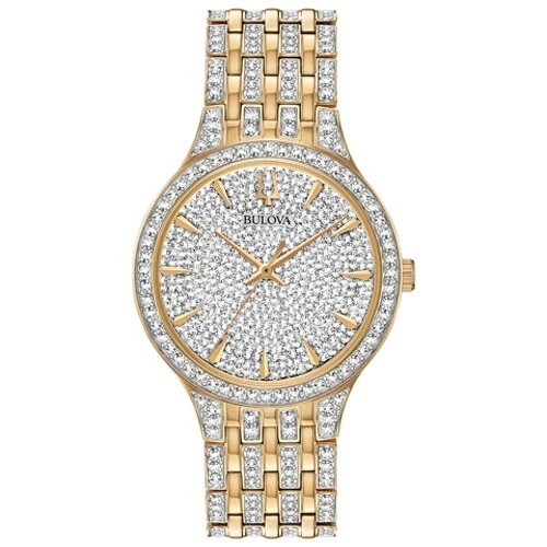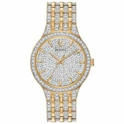 This Mens Bulova phantom crystal pave bracelet watch is an absolutely stunning piece in a new slim and sleek style. It is embellished with 636 crystals and features a silver and gold tone stainless steel case and bracelet with a clear pave dial. Other features include a flat mineral crystal and a quartz movement. Water resistance to 30 meters. Case Size: 32mm. Limited Manufacturer’s Warranty.