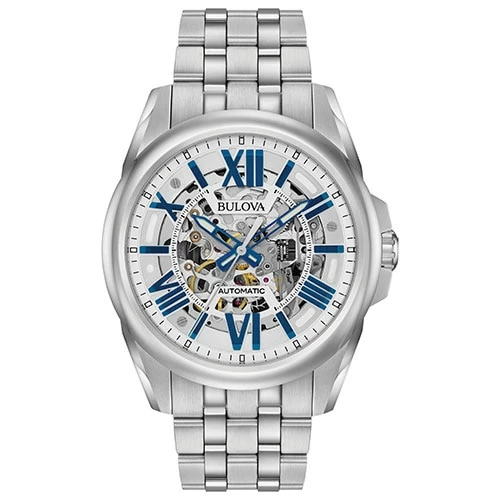 The Mens Bulova Automatic Collection stainless steel case watch features a silver and blue skeleton dial, and exhibition case back. A self winding movement, flat mineral glass, a masculine Stainless Steel bracelet with a simple double press deployment closure, and is water resistance to 100 meters. Dimensions: 43mm.Style 96A187.Limited Manufacturer’s Warranty.