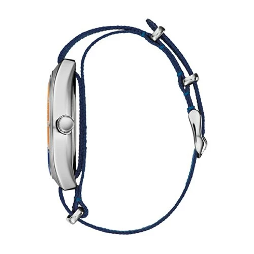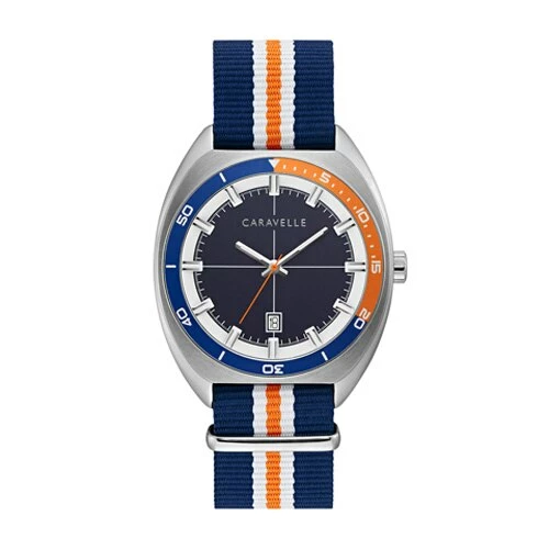 This Mens Caravelle Nato nylon strap watch is retro inspired. Its design showcases a bi-colored bezel of navy and orange that perfectly matches the striped NATO strap. Other features include a silver-tone sliding clasp, a buckle closure, a sharp two-tone brushed and polished stainless steel case, and a navy matte textured dial that boasts fine cross-hair detail. It is finished with a date feature at 6 oāclock and luminous hands with an orange second hand. Water resistance to 50 meters. Case Size: 40mm.