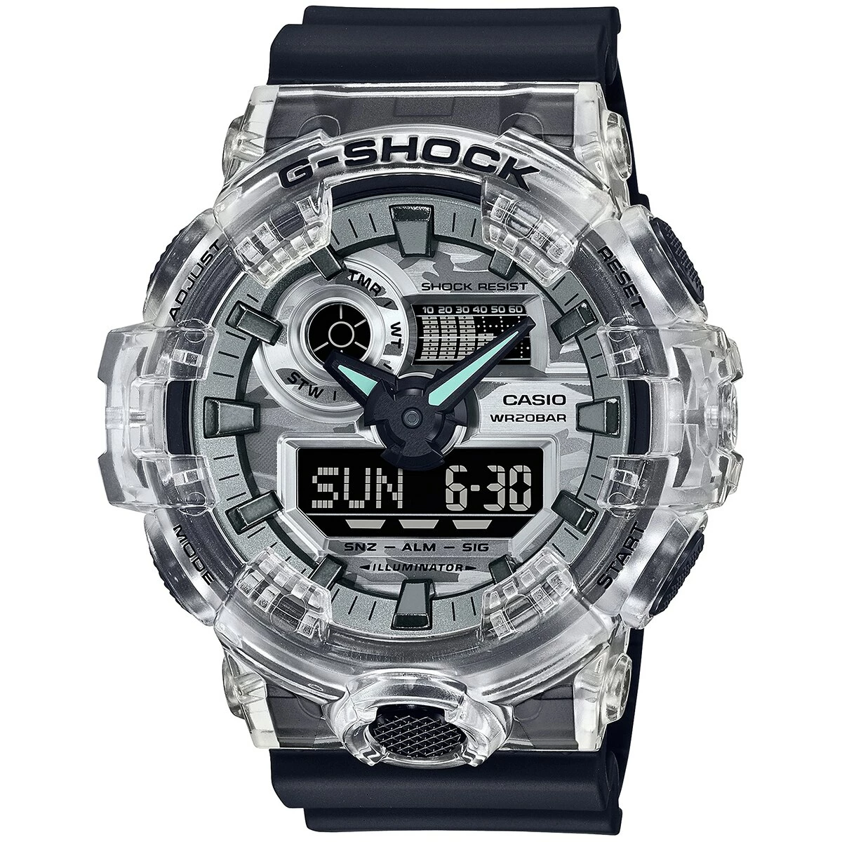 Mens Casio G-Shock analog digital watch, quartz, black resin strap, 53.4mm case, grey and black camo on face, day and date display, 200m water resistant