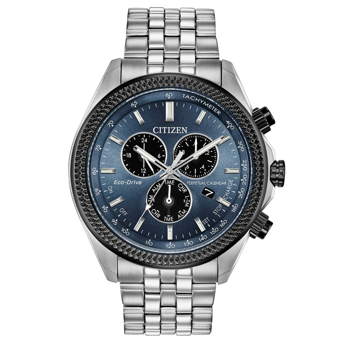 Taking it up a notch with the reinvented Mens Citizen Perpetual Calendar Chrono timepiece with a 1/20 second chronograph, perpetual calendar, and dual time in a stainless steel case and bracelet completed with a blue-gray dial. Featuring our Eco-Drive technology ā powered by light, any light. Never needs a battery.