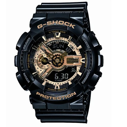 The G-Shock adds high gloss finishes and gold dials to its X-Large case designs for a visually powerful look. Its case has a powerful presence and is shock resistant and the anti-magnetic structure confirms its toughness. Thereās a reason why G-Shock is known as The toughest watch in the World.Style GA110GB-1A.