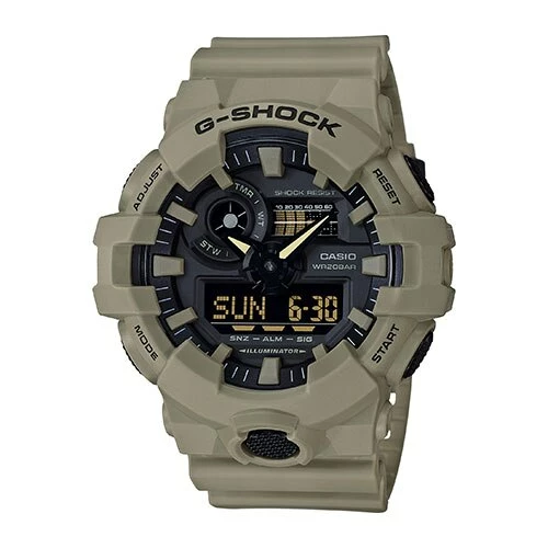Mens G-Shock Utility Color Collection watch was inspired by the color palettes found in military uniforms and utility jackets, the new collection sees the GA700UC-5A outfitted in tan shades to complement the ongoing military color trend. Features include Super Illuminator LED Light with Afterglow, World Time, 4 Daily Alarms and 1 Snooze Alarm, Hourly Time Signal, 1/100 Second Stopwatch, Countdown Timer, Hand shift feature, Full auto-calendar, and 12/24 Hour Formats. Shock resistant and water resistant to 200 meters. Case size: 57.5 x 53.4 x 18.4mm/69g.