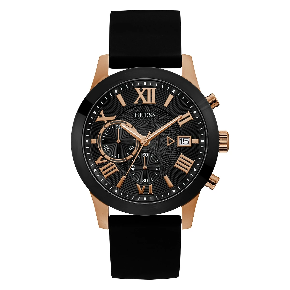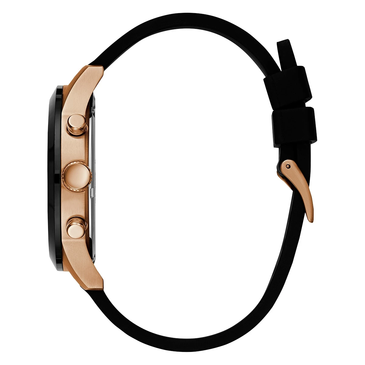Mens Guess Chronograph Watch. Classic styling with a modern chronograph for great looks and sporty versatility. Features include chronograph function with stopwatch function and date, brushed rose gold-tone steel 44.5mm case with a black top ring, black dial with rose gold-tone Roman numerals and hands, and smooth black silicone strap. Water-resistant to 50 meters/165 feet.Limited Manufacturer’s Warranty.