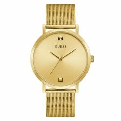Simple details with a genuine diamond marker at the 12 o’clock hour make this watch the perfect gift or self purchase! This Mens Guess polished gold-tone 44MM steel case is featured on a self-adjustable mesh bracelet. Analog function with second hand sweep. Water resistant up to 30M.