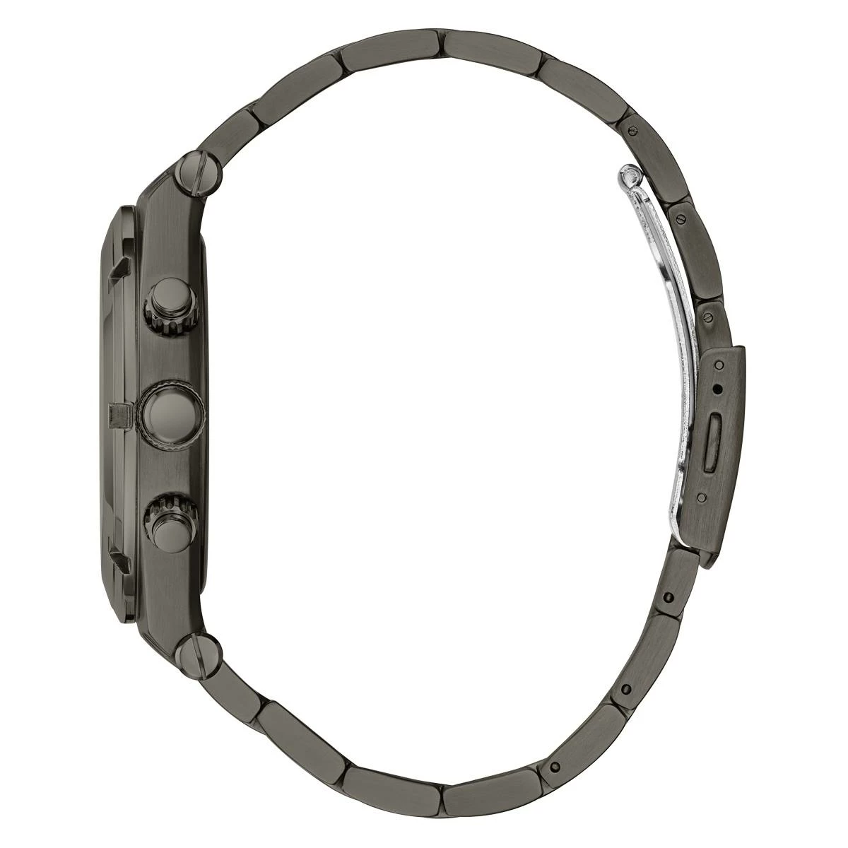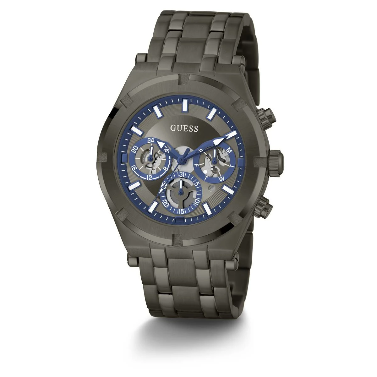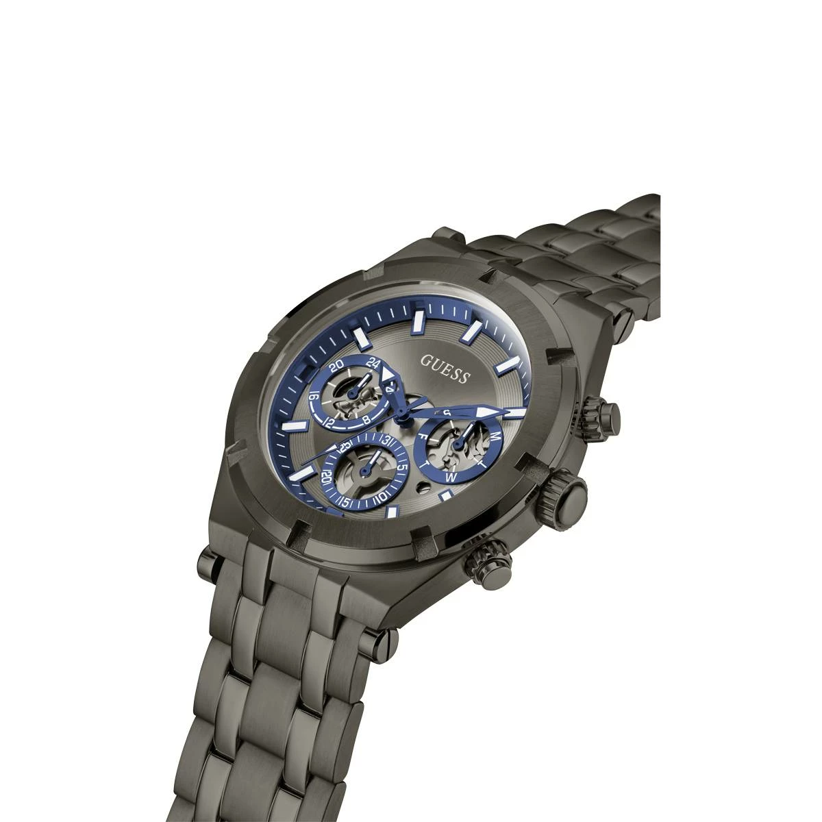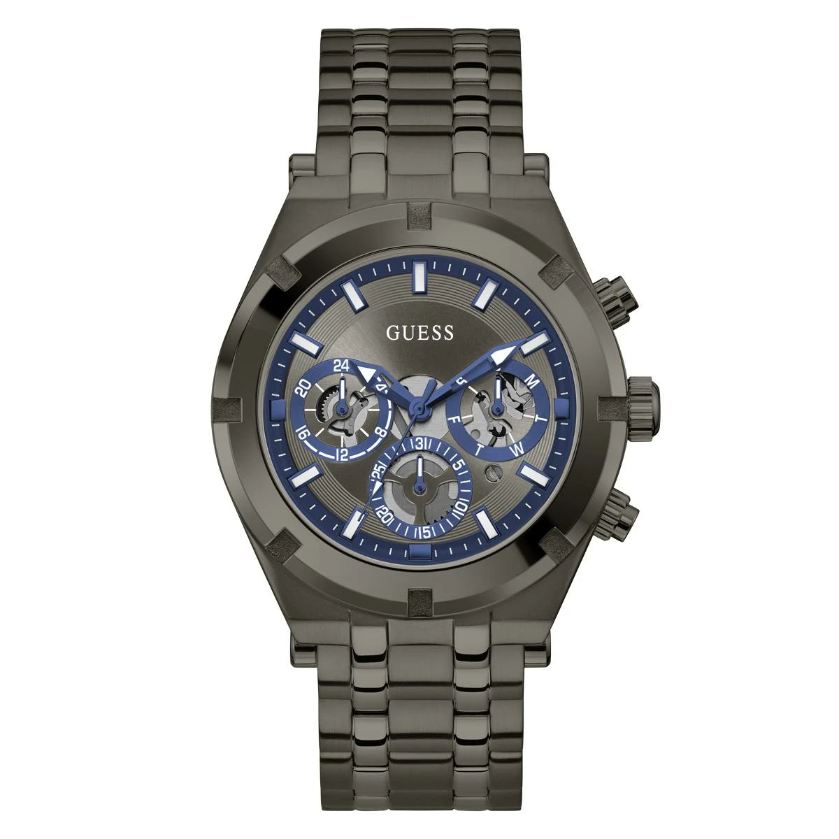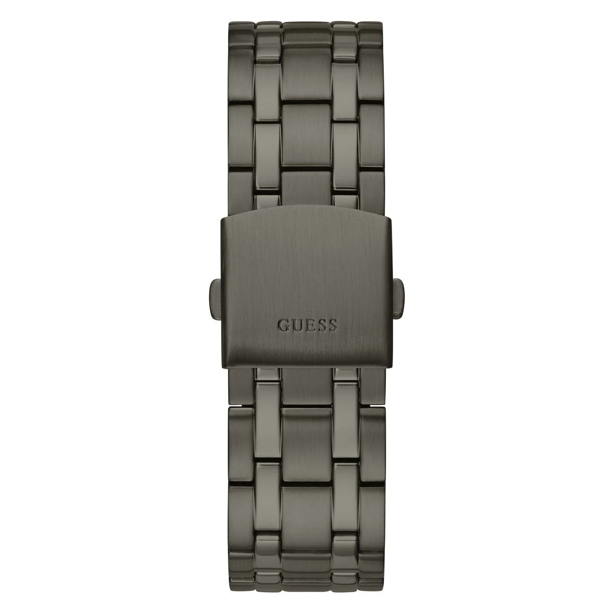 Style meets functionality with this Mens Guess multi-function chrono-look style with skeleton details to the sub-eyes that showcase the movement of the watch. Gunmetal stainless steel case and strap.Band