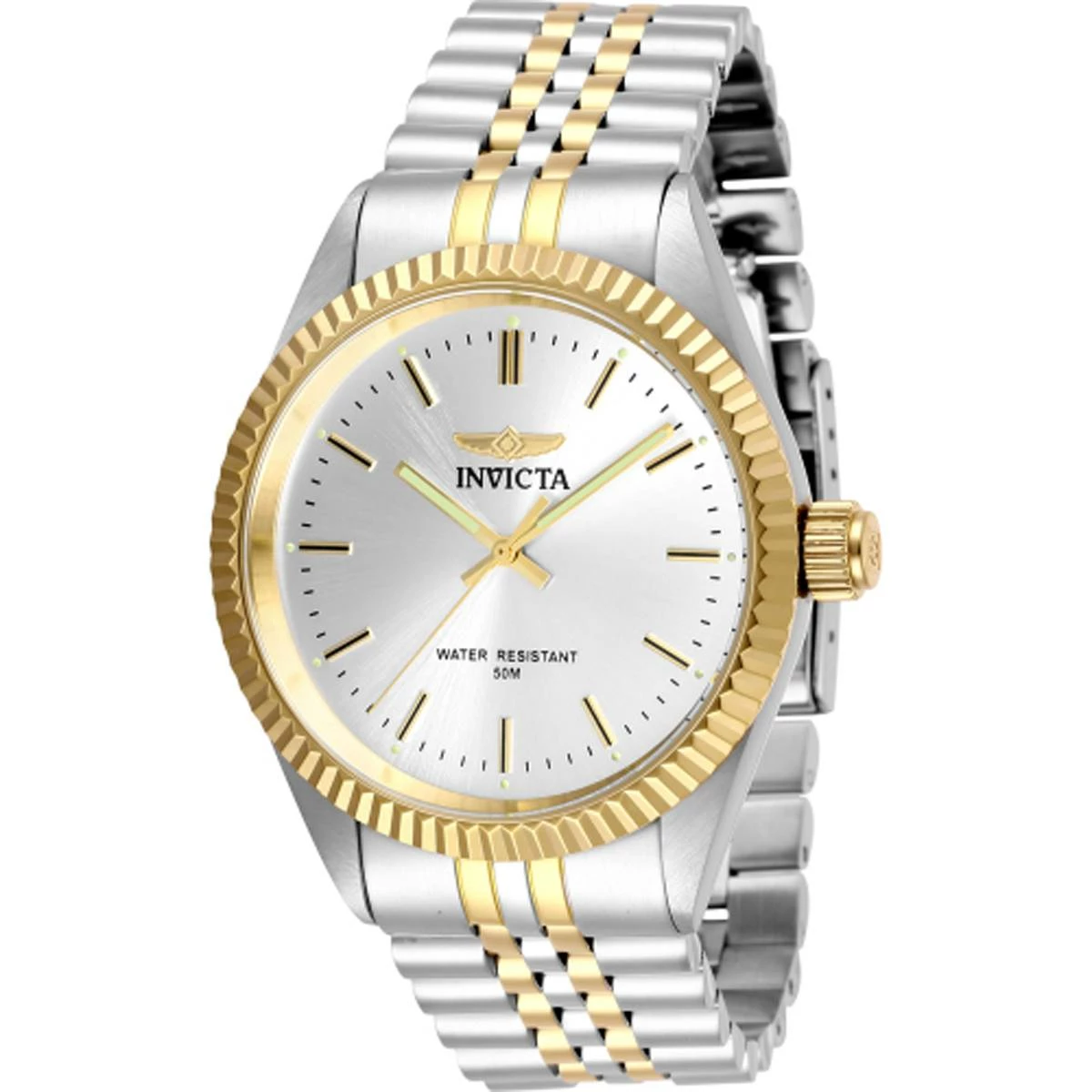 Tell time in style with this Mens Invicta Specialty stainless steel gold and steel silver dial PC21J quartz watch.Band