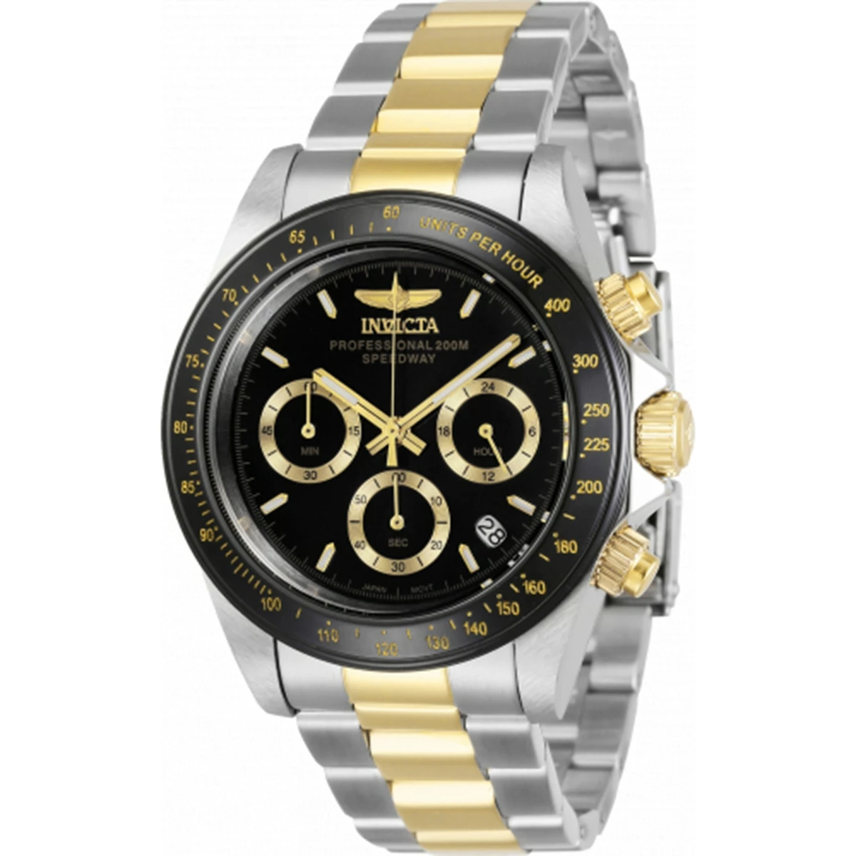 The Mens INVICTA speedway watch features a 39.5mm stainless steel gold and black case and a steel black dial.