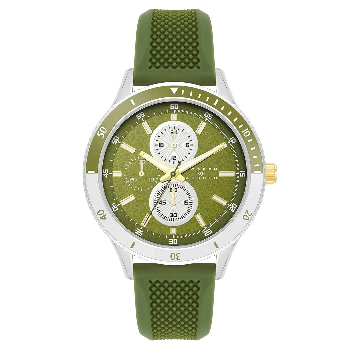 Sporty and stylish this Mens Joseph Abboud green silicone strap watch features a green accented top ring and faux sub-dial detail.