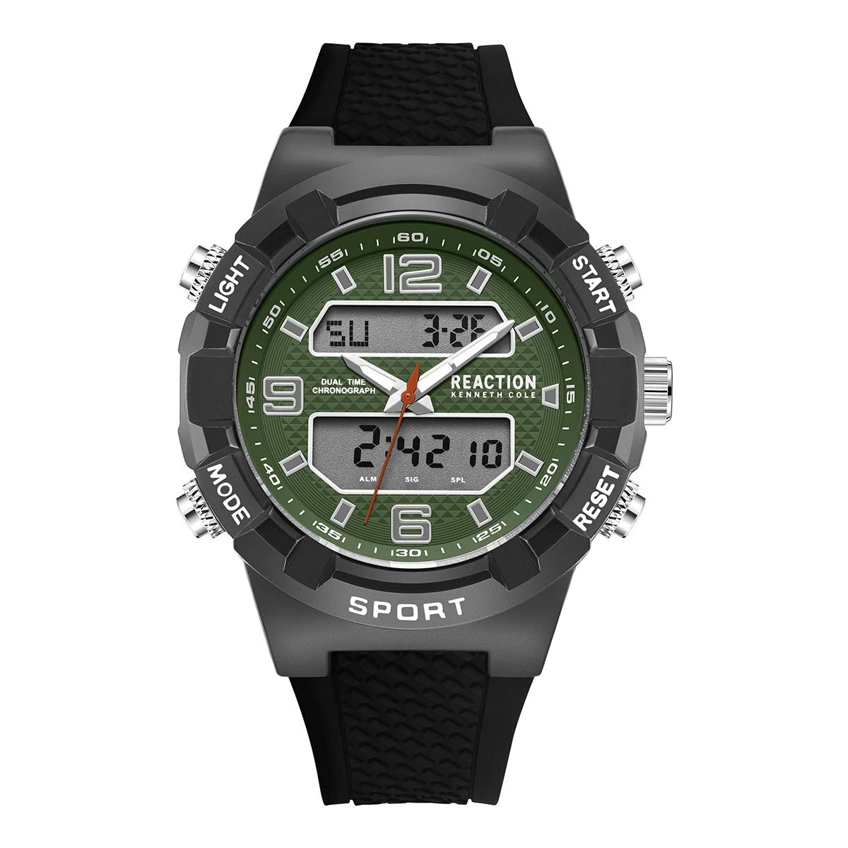 Tell time in style wearing the Mens Kenneth Cole® Reaction™ analog and digital watch with a gunmetal 46mm case. The textured green dial features grey hour markers with two digital window displays, and the watch is completed with a textured silicone black strap.
