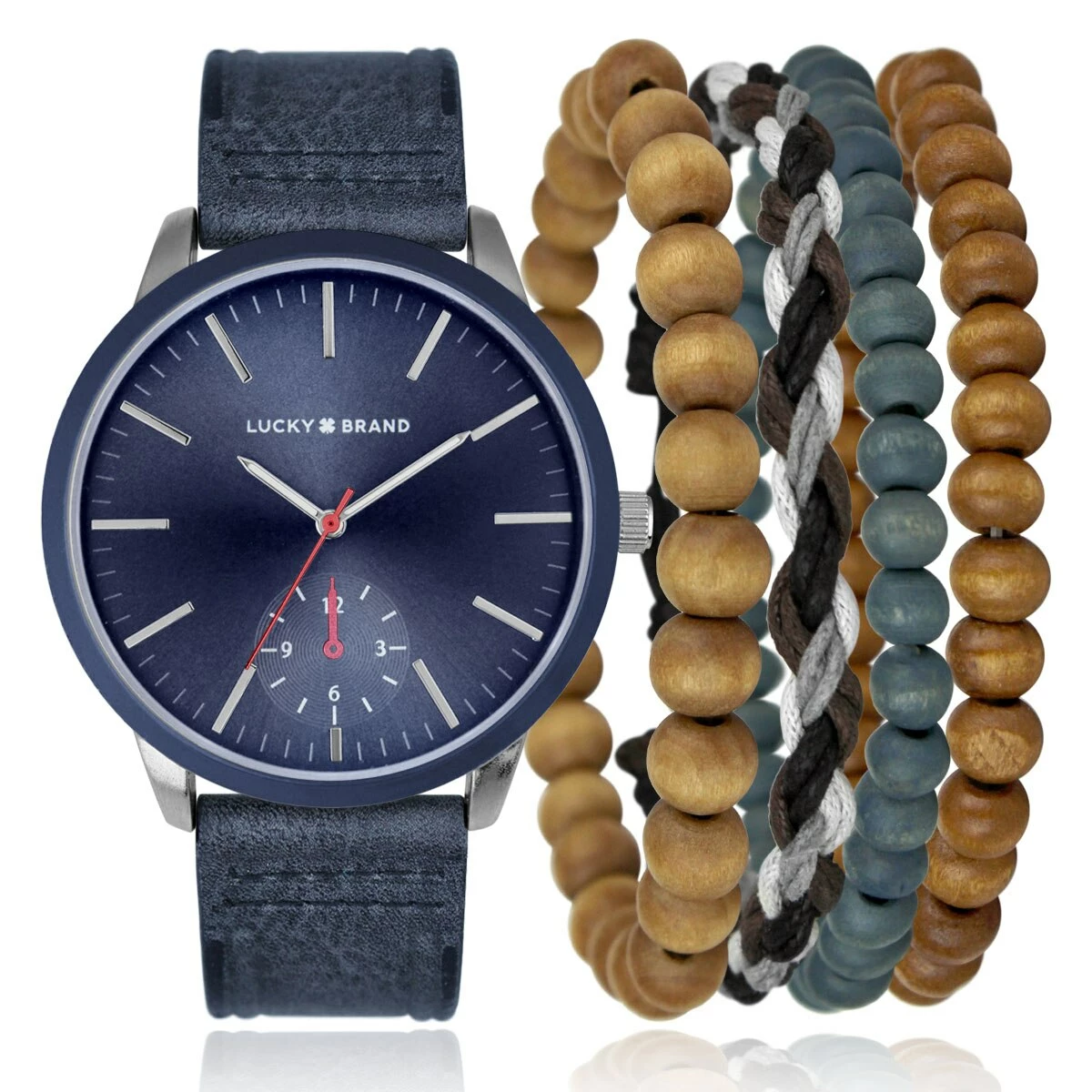 Complete your daily ensembles in chic, practical style with this Mens Lucky Brand Dylan matte silver and rustic navy seafaring faux chrono boho genuine leather watch set.