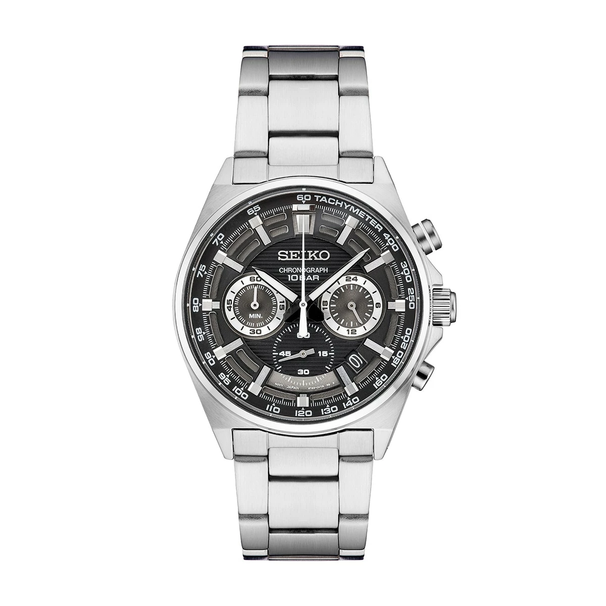 Mens Seiko essentials quartz chronograph, 41mm stainless steel case, and bracelet, black dial.