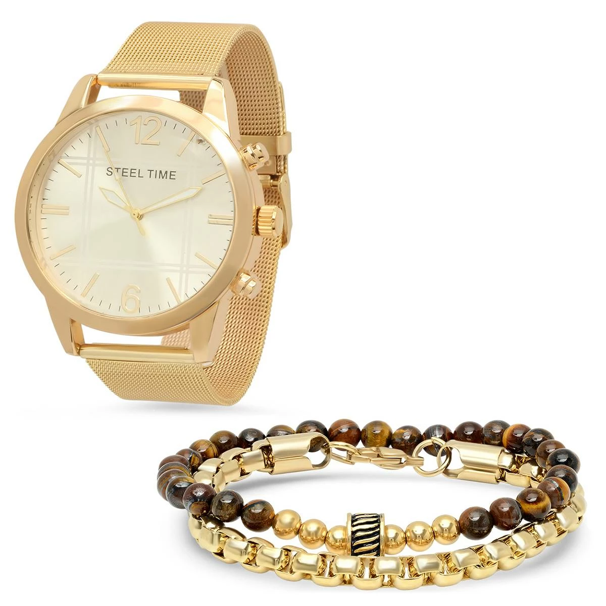 This Mens Steeltime stainless steel 18kt. plated watch features a mesh strap with buckle closure and an alloy face with stainless steel backing. This watch also comes with a gold bracelet and a brown and gold beaded bracelet for added fashion or by themselves.
