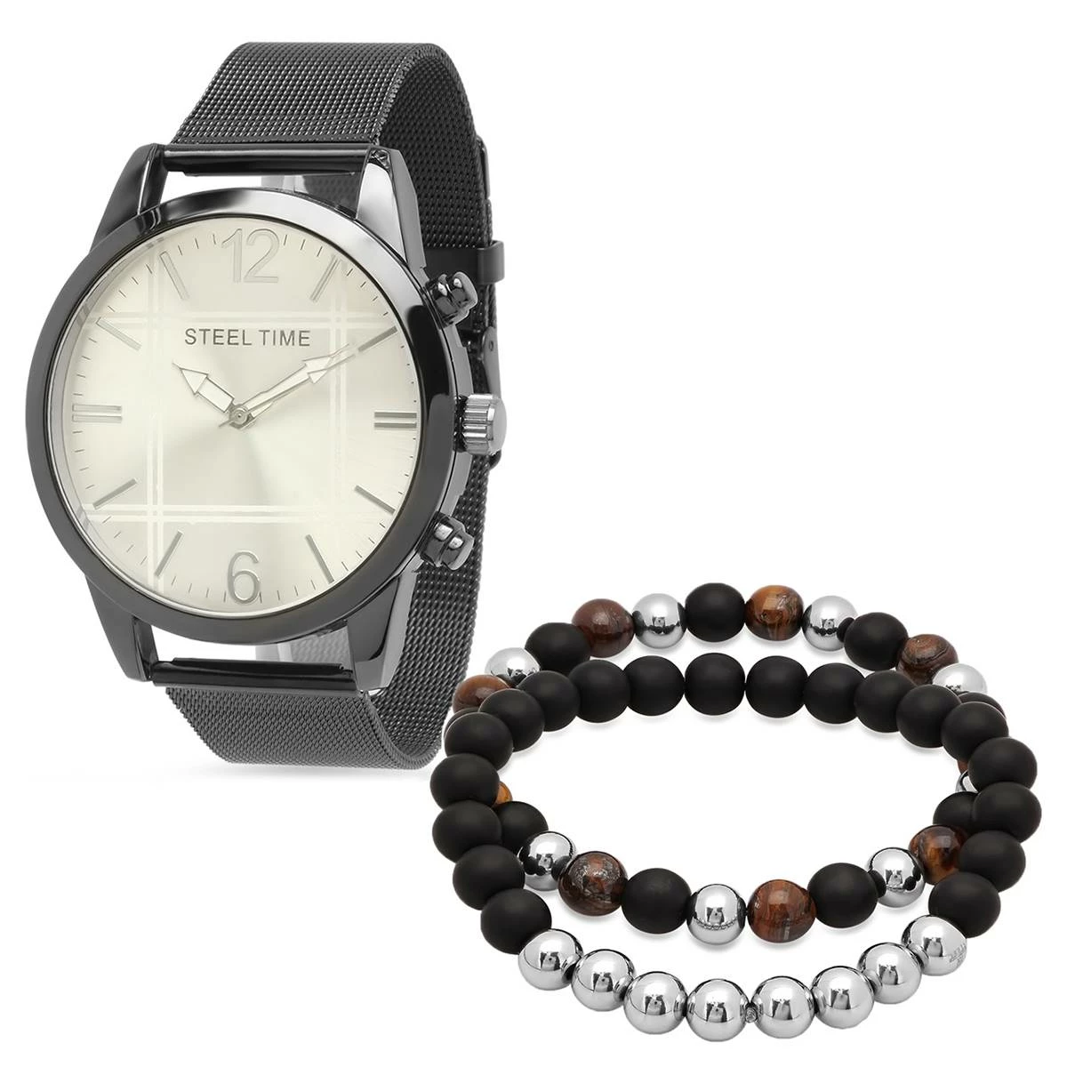 This Mens Steeltime black watch features a stainless steel mesh strap with a buckle closure and an alloy face with a stainless steel backing. This set comes with two accent bracelets that you can wear with the watch or as a separate piece.