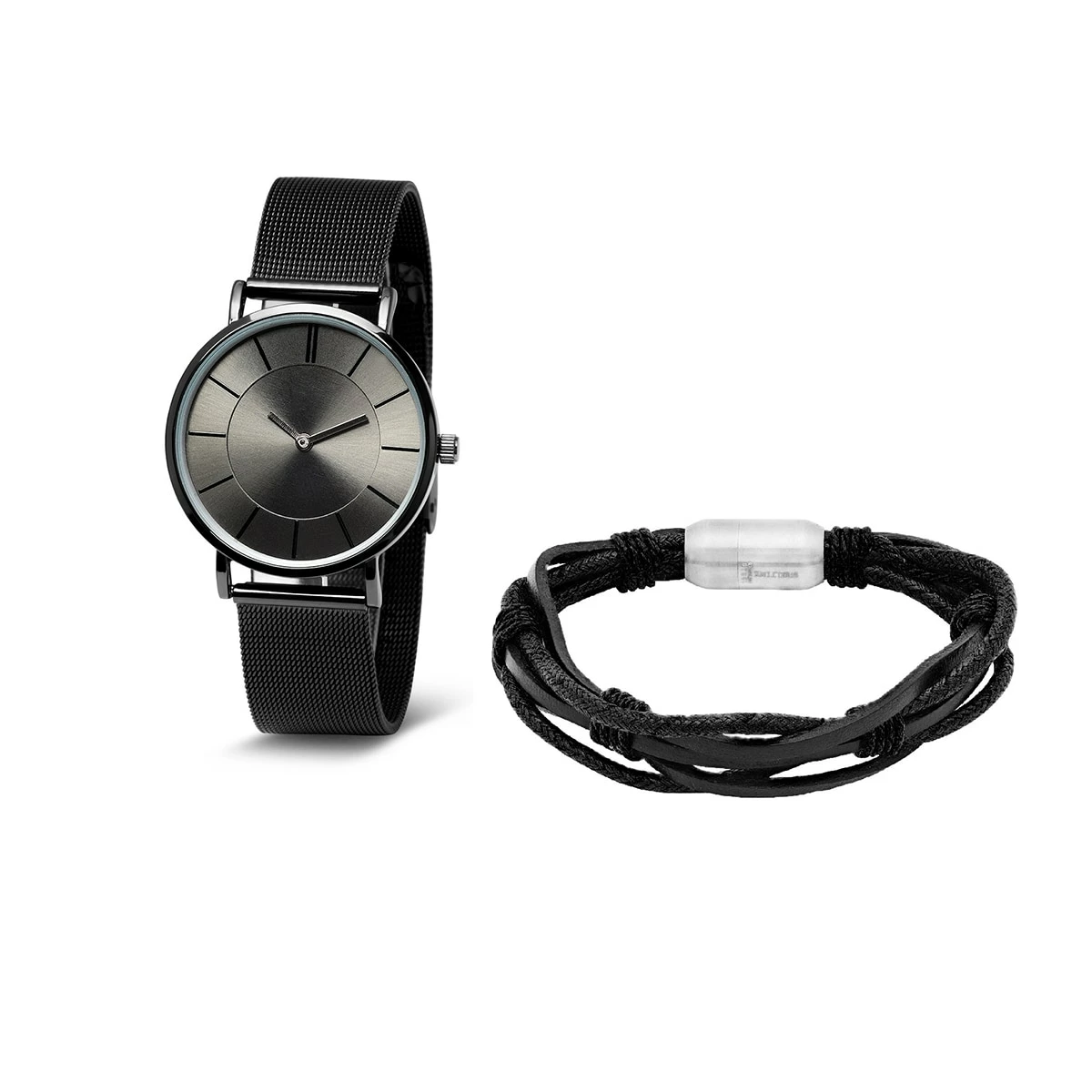 The Mens Steeltime watch set showcases a black IP stainless steel watch with a mesh fold-over closure. Wear alongside the black leather bracelet with stainless steel accents.Style C6-002-W-918-004-B