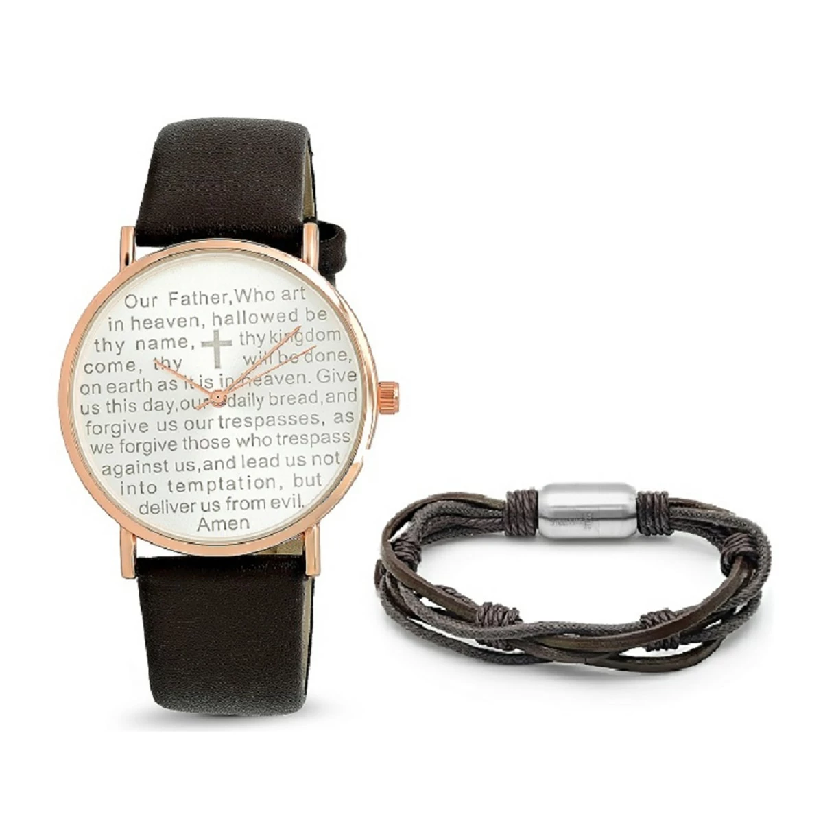 The Mens Steeltime watch set showcases a rose gold plated prayer watch that has an Alloy face with an “Our Father” Prayer on the inside face, an 18kt. rose gold plated Stainless Steel backing, and a brown simulated leather buckle strap. Wear alongside the braided brown leather bracelet with stainless steel accents.Style B80-183-W-918-003-B
