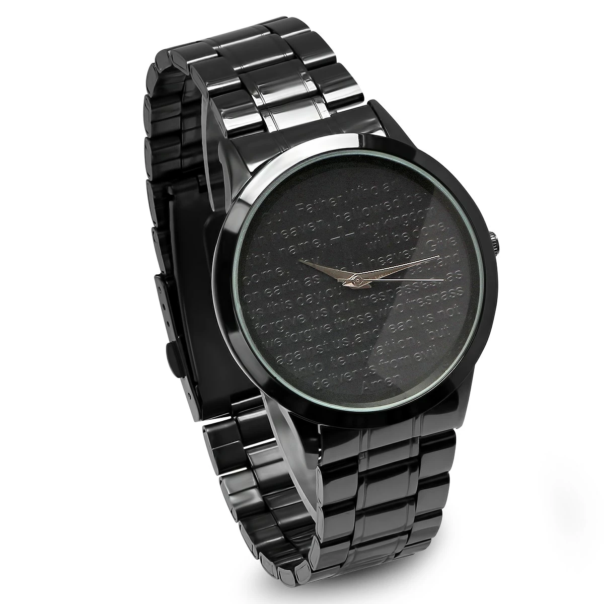 This Mens Steeltime watch showcases a black IP stainless steel fold-over strap for a snug and comfortable fit. The watch features a black alloy face that has the Lord’s Prayer depicted on the face.Style B80-011-W
