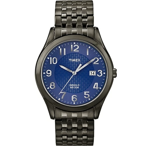 This Mens Timex® black dial watch showcases a trendy and modern design. It features a stainless steel expansion band, a full black Arabic dial with the date, and is water resistant up to 30 meters. Height: 9mm, Width: 40mm.