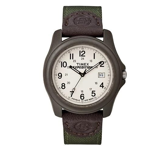 This Mens Timex® Expedition Green Camper watch showcases a beautiful and casual outdoor design with mixture of nylon and leather for the strap. It features a comfortable buckle closure, an easy-set quick date®, and is water resistance up to 50 meters. Case Dimensions: Height: 9.5mm, Width: 39mm. Height: 9.5 mm, Width: 39 mm Style T491019J. Your TIMEX® watch is warranted against manufacturing defects by Timex Group USA, Inc. for a period of ONE YEAR from the original purchase date.