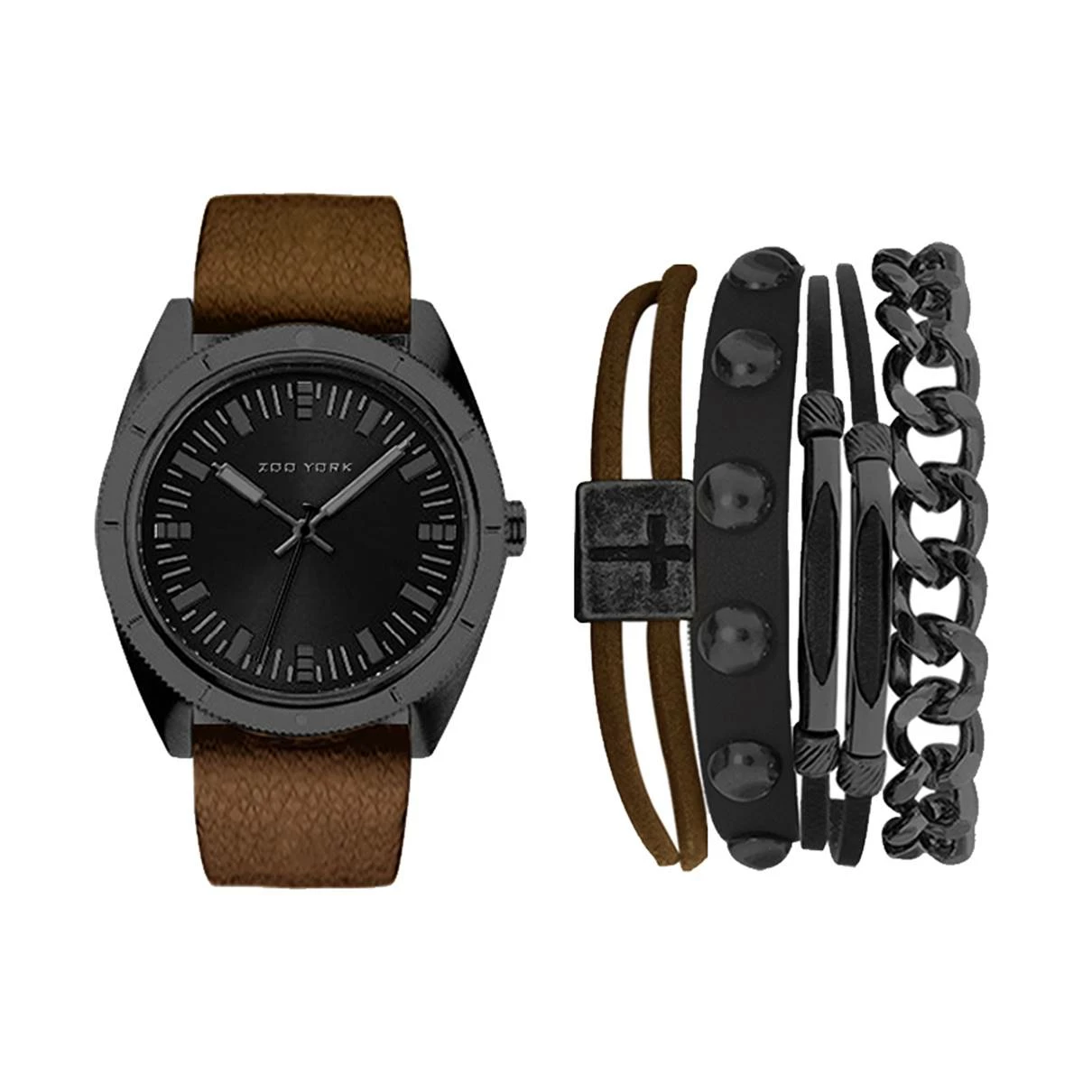 Mens Zoo York quartz movement black dial and brown leather analog watch with stackable bracelet set. We’ve got the classic watch style you love. Black metal round case with black dial. Minute marker around the rim and logo beneath the 12 o’clock position. It comprises index markers in addition to the hour, minute, and second clock hands. Pull/push crown and brown leather strap including a buckle clasp.Whether you’re looking for an everyday watch, something for a special occasion, or a gift for loved ones, this is the one. Plus the multi-color stackable bracelet set offers the best class design that can be worn on an everyday basis.