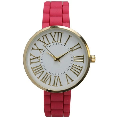 This Olivia Pratt classy watch showcases a bold design. It features large Roman numeral markers and a sleek hot pink silicone strap with simple buckle closure.Style 40037HOTPINK.Limited Manufacturer’s Warranty.