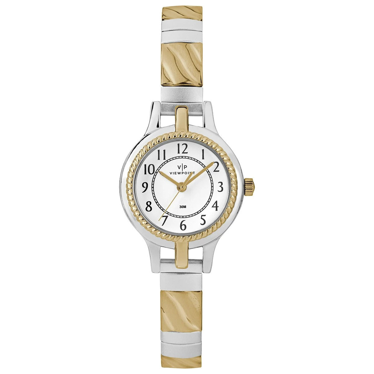 Timex® Viewpoint Arabic dial watch. There’s power in simplicity. Adding a hint of understated elegance to your look, this Viewpoint by Timex® watch features a two-tone case, classic Arabic dial and a two-tone expansion band. The unique case detail offers a truly timeless look.Limited Manufacturer’s Warranty.Your TIMEX® watch is warranted against manufacturing defects by Timex Group USA, Inc. for a period of ONE YEAR from the original purchase date.