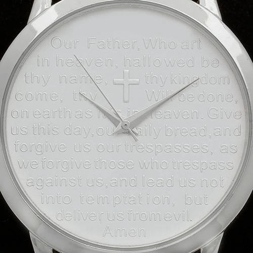 The Unisex 18kt. white gold plated Our Lord’s prayer watch features a stainless steel backing. The leather band of the watch can adjust from 7.5-9 inches. Case dimensions: 43mm.Style 998-010-W