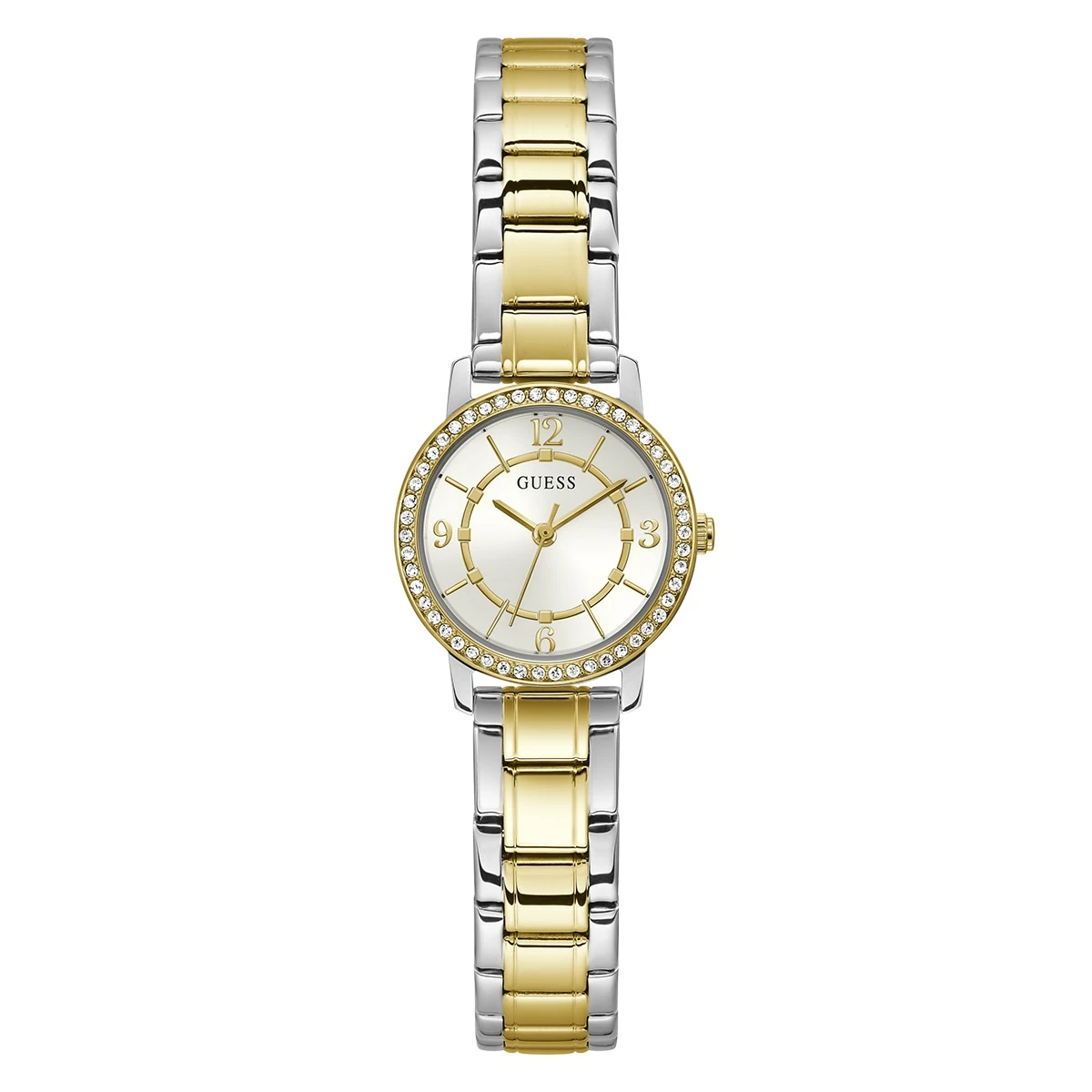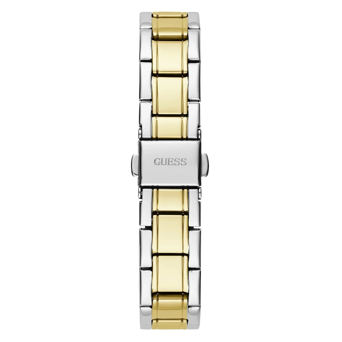 Dress this pretty and petite style up or down, its glitz details are the perfect hint of elegance but can still be worn with everyday looks. Polished two-tone 28 MM stainless steel case. Pilot buckle clasp. Water resistant up to 30 M.