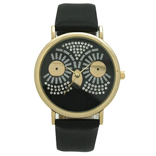 This Womens Olivia Pratt rhinestone owl watch features rhinestone owl eyes on the dial with a gold-tone bezel and case. The leather strap is adjustable for a comfortable and secure fit with a buckle closure. Wipe clean with a dry cloth. Case: 42mm. Band: 9 inches.